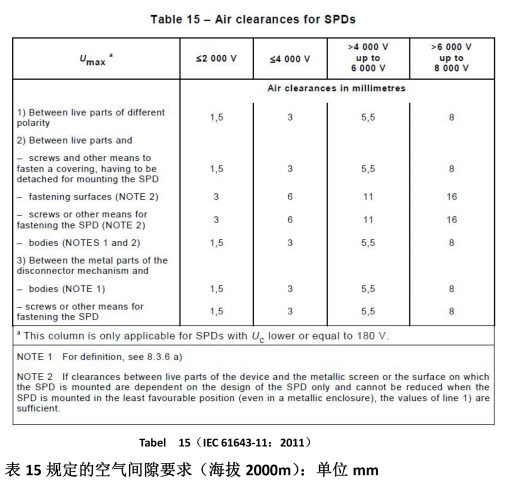 在标准大气压(H≤2000m)下,户外型和户内型SPD,带电部件和地之间的电气间隙和爬电距离不应小于GB18802.1-2011 表14 和表15 的规定值:
